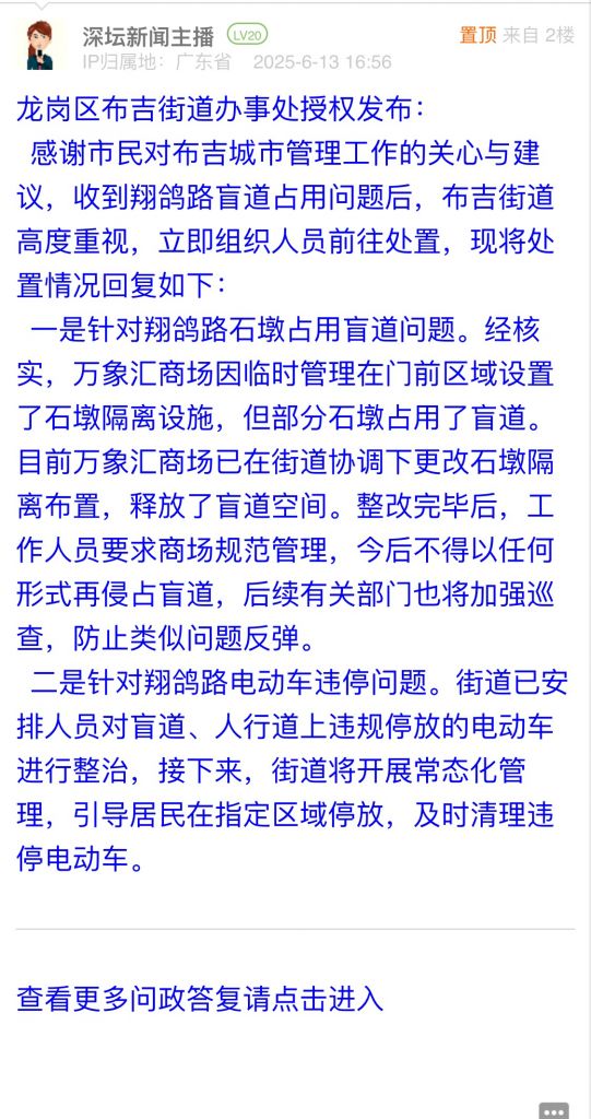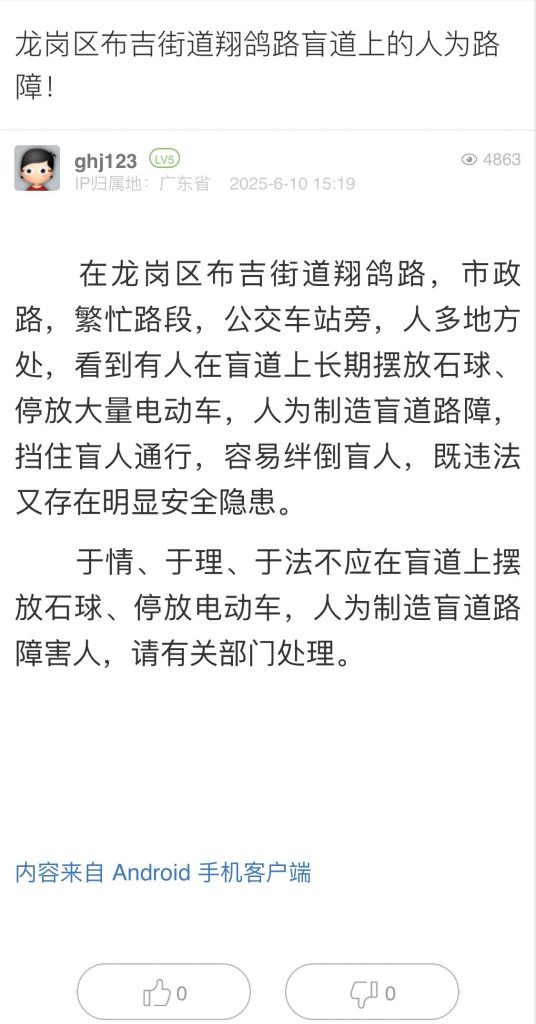7. 帖文《龍崗區(qū)布吉街道翔鴿路盲道上的人為路障!》