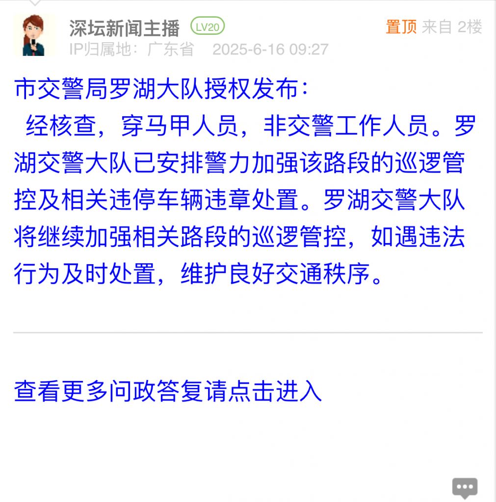 經(jīng)核查,穿馬甲人員,非交警工作人員。羅湖交警大隊已安排警力加強該路段的巡邏管控及相關(guān)違停車輛違章處置。羅湖交警大隊將繼續(xù)加強相關(guān)路段的巡邏管控,如遇違法行為及時處置,維護良好交通秩序。