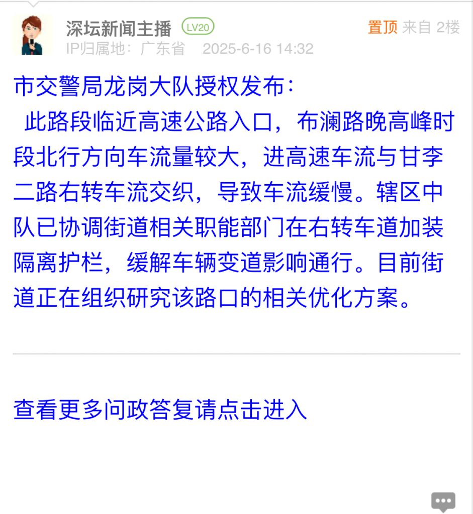 此路段臨近高速公路入口,布瀾路晚高峰時段北行方向車流量較大,進高速車流與甘李二路右轉(zhuǎn)車流交織,導(dǎo)致車流緩慢。轄區(qū)中隊已協(xié)調(diào)街道相關(guān)職能部門在右轉(zhuǎn)車道加裝隔離護欄,緩解車輛變道影響通行。目前街道正在組織研究該路口的相關(guān)優(yōu)化方案。