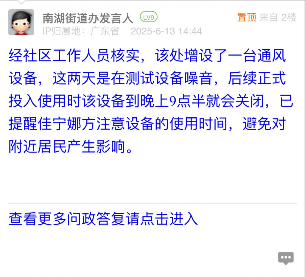 經(jīng)社區(qū)工作人員核實,該處增設(shè)了一臺通風設(shè)備,這兩天是在測試設(shè)備噪音,后續(xù)正式投入使用時該設(shè)備到晚上9點半就會關(guān)閉,已提醒佳寧娜方注意設(shè)備的使用時間,避免對附近居民產(chǎn)生影響。