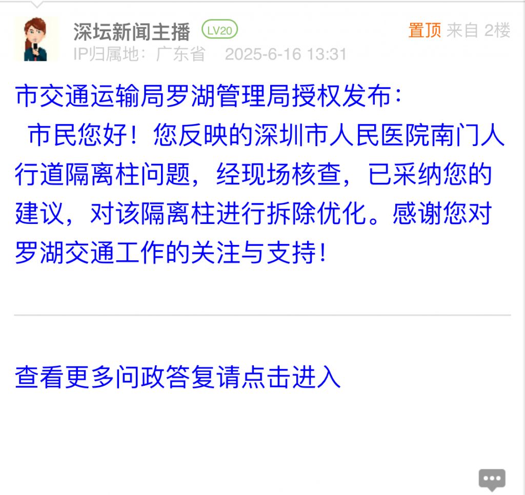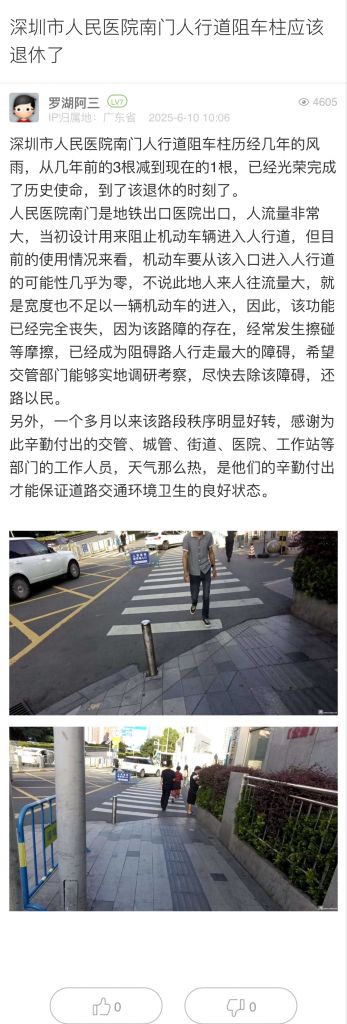 5. 帖文《深圳市人民醫(yī)院南門人行道阻車柱應(yīng)該退休了》