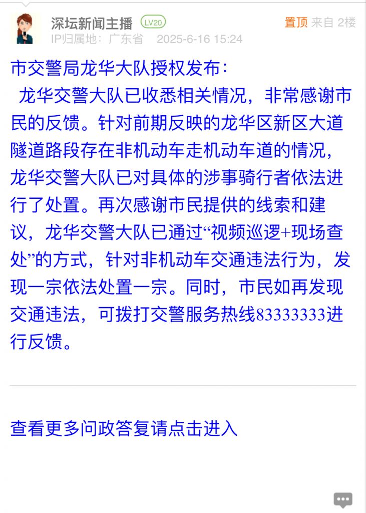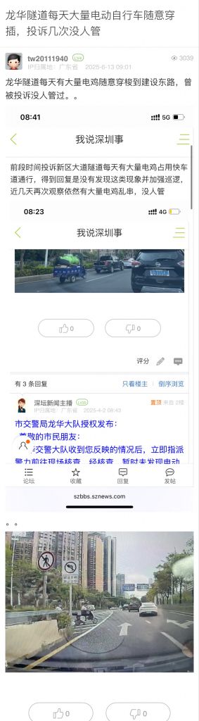 14. 帖文《龍華隧道每天大量電動自行車隨意穿插,投訴幾次沒人管》