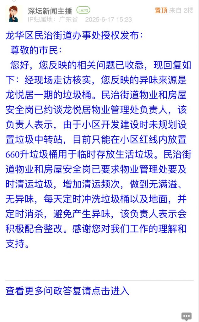 您好,您反映的相關(guān)問題已收悉,現(xiàn)回復(fù)如下:經(jīng)現(xiàn)場走訪核實,您反映的異味來源是龍悅居一期的垃圾桶。民治街道物業(yè)和房屋安全崗已約談龍悅居物業(yè)管理處負責人,該負責人表示,由于小區(qū)開發(fā)建設(shè)時未規(guī)劃設(shè)置垃圾中轉(zhuǎn)站,目前只能在小區(qū)紅線內(nèi)放置660升垃圾桶用于臨時存放生活垃圾。民治街道物業(yè)和房屋安全崗已要求物業(yè)管理處要及時清運垃圾,增加清運頻次,做到無滿溢、無異味,每天定時沖洗垃圾桶以及地面,并定時消殺,避免產(chǎn)生異味,該負責人表示會積極配合整改。感謝您對我們工作的理解和支持。