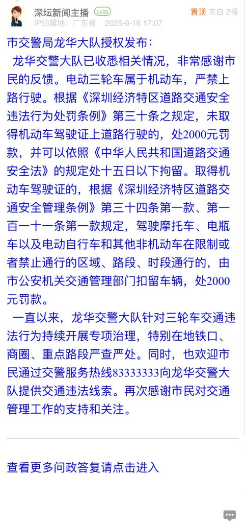 龍華交警大隊已收悉相關(guān)情況,非常感謝市民的反饋。電動三輪車屬于機動車,嚴禁上路行駛。根據(jù)《深圳經(jīng)濟特區(qū)道路交通安全違法行為處罰條例》第三十條之規(guī)定,未取得機動車駕駛證上道路行駛的,處2000元罰款,并可以依照《中華人民共和國道路交通安全法》的規(guī)定處十五日以下拘留。取得機動車駕駛證的,根據(jù)《深圳經(jīng)濟特區(qū)道路交通安全管理條例》第三十四條第一款、第一百一十一條第一款規(guī)定,駕駛摩托車、電瓶車以及電動自行車和其他非機動車在限制或者禁止通行的區(qū)域、路段、時段通行的,由市公安機關(guān)交通管理部門扣留車輛,處2000元罰款。