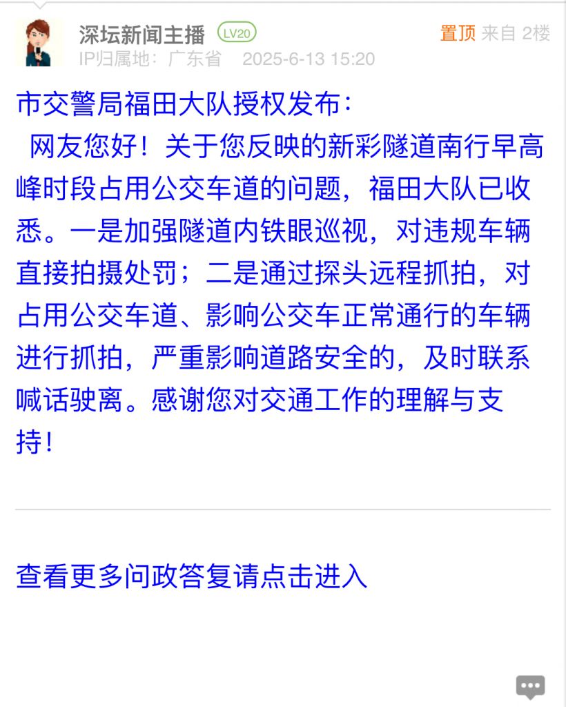 網(wǎng)友您好!關(guān)于您反映的新彩隧道南行早高峰時段占用公交車道的問題,福田大隊已收悉。一是加強隧道內(nèi)鐵眼巡視,對違規(guī)車輛直接拍攝處罰;二是通過探頭遠程抓拍,對占用公交車道、影響公交車正常通行的車輛進行抓拍,嚴重影響道路安全的,及時聯(lián)系喊話駛離。感謝您對交通工作的理解與支持!