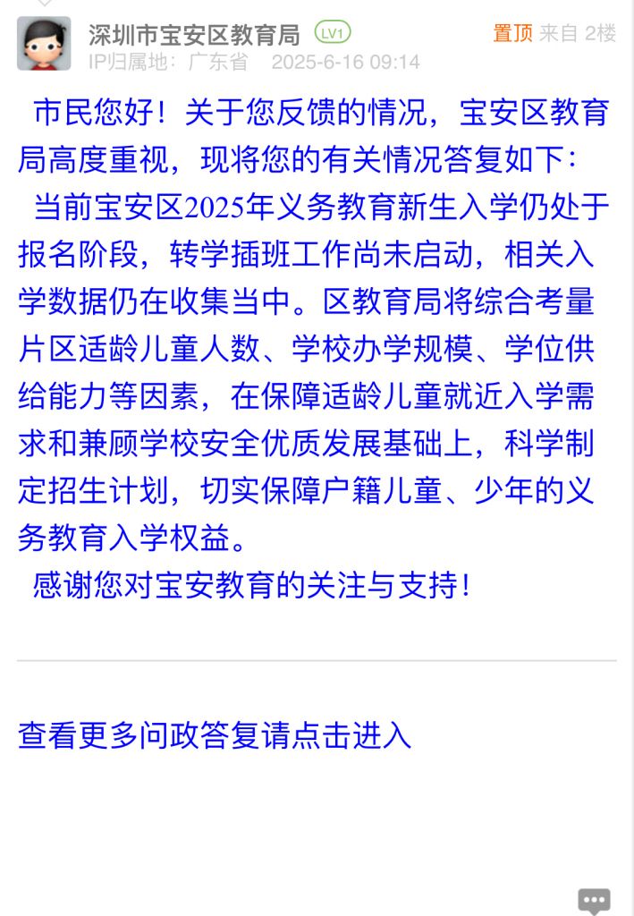 當前寶安區(qū)2025年義務(wù)教育新生入學仍處于報名階段,轉(zhuǎn)學插班工作尚未啟動,相關(guān)入學數(shù)據(jù)仍在收集當中。區(qū)教育局將綜合考量片區(qū)適齡兒童人數(shù)、學校辦學規(guī)模、學位供給能力等因素,在保障適齡兒童就近入學需求和兼顧學校安全優(yōu)質(zhì)發(fā)展基礎(chǔ)上,科學制定招生計劃,切實保障戶籍兒童、少年的義務(wù)教育入學權(quán)益。