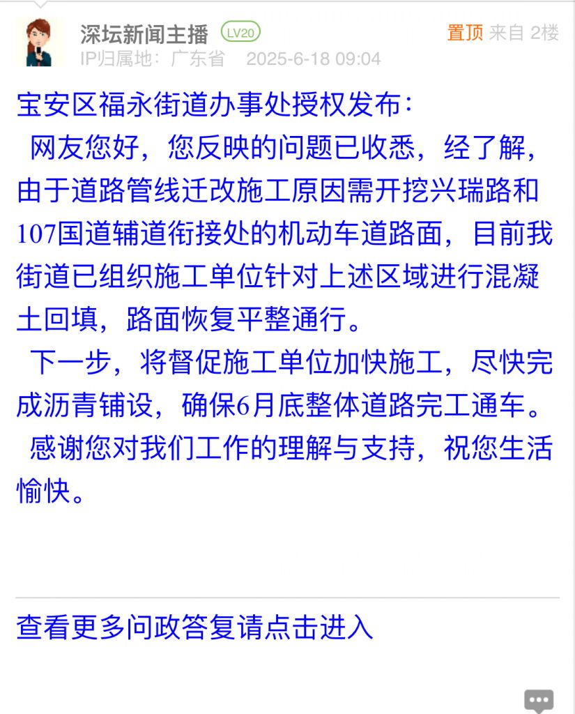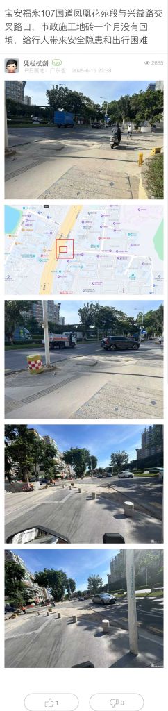 19. 帖文《寶安福永107國道鳳凰花苑段與興益路交叉路口,市政施工地磚一個月沒有回填,給行人帶來安全隱患和出行困難》