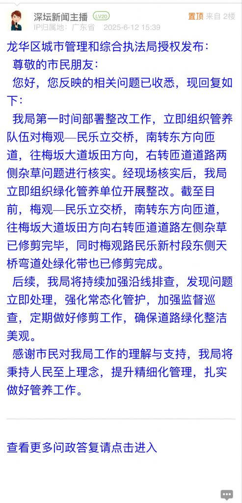6. 帖文《關(guān)于龍華區(qū)民治街道辦(梅觀~民樂)立交路段綠化管養(yǎng)問題的訴求與建議》