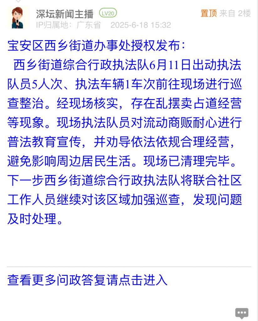 西鄉(xiāng)街道綜合行政執(zhí)法隊6月11日出動執(zhí)法隊員5人次、執(zhí)法車輛1車次前往現(xiàn)場進行巡查整治。經(jīng)現(xiàn)場核實,存在亂擺賣占道經(jīng)營等現(xiàn)象?,F(xiàn)場執(zhí)法隊員對流動商販耐心進行普法教育宣傳,并勸導(dǎo)依法依規(guī)合理經(jīng)營,避免影響周邊居民生活。現(xiàn)場已清理完畢。下一步西鄉(xiāng)街道綜合行政執(zhí)法隊將聯(lián)合社區(qū)工作人員繼續(xù)對該區(qū)域加強巡查,發(fā)現(xiàn)問題及時處理。