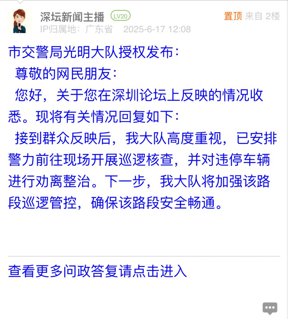 對來信人反映的情況,交警支隊羅湖大隊已第一時間派警力前往現(xiàn)場違停整治。