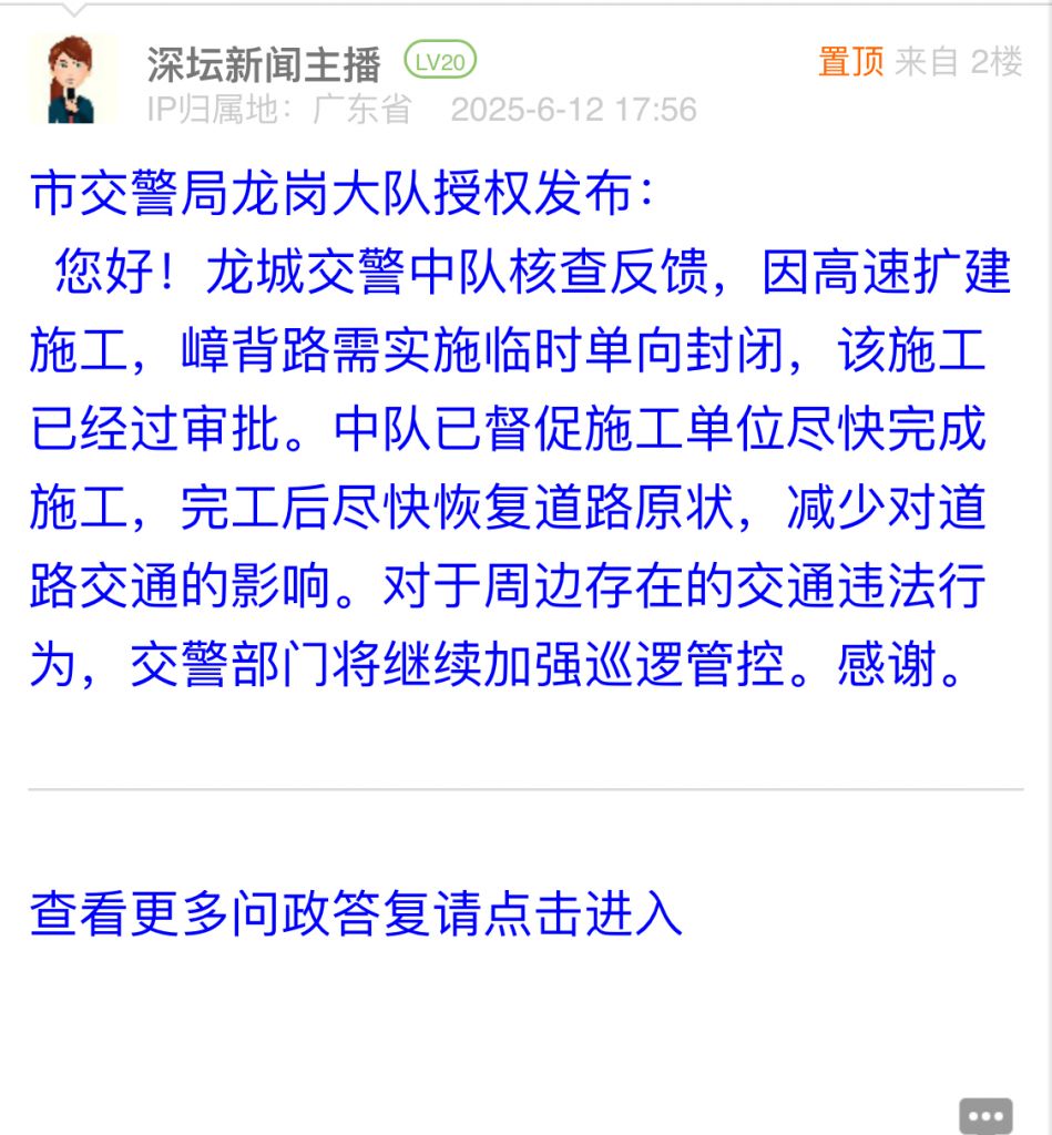 您好!龍城交警中隊核查反饋,因高速擴建施工,嶂背路需實施臨時單向封閉,該施工已經(jīng)過審批。中隊已督促施工單位盡快完成施工,完工后盡快恢復(fù)道路原狀,減少對道路交通的影響。對于周邊存在的交通違法行為,交警部門將繼續(xù)加強巡邏管控。感謝。