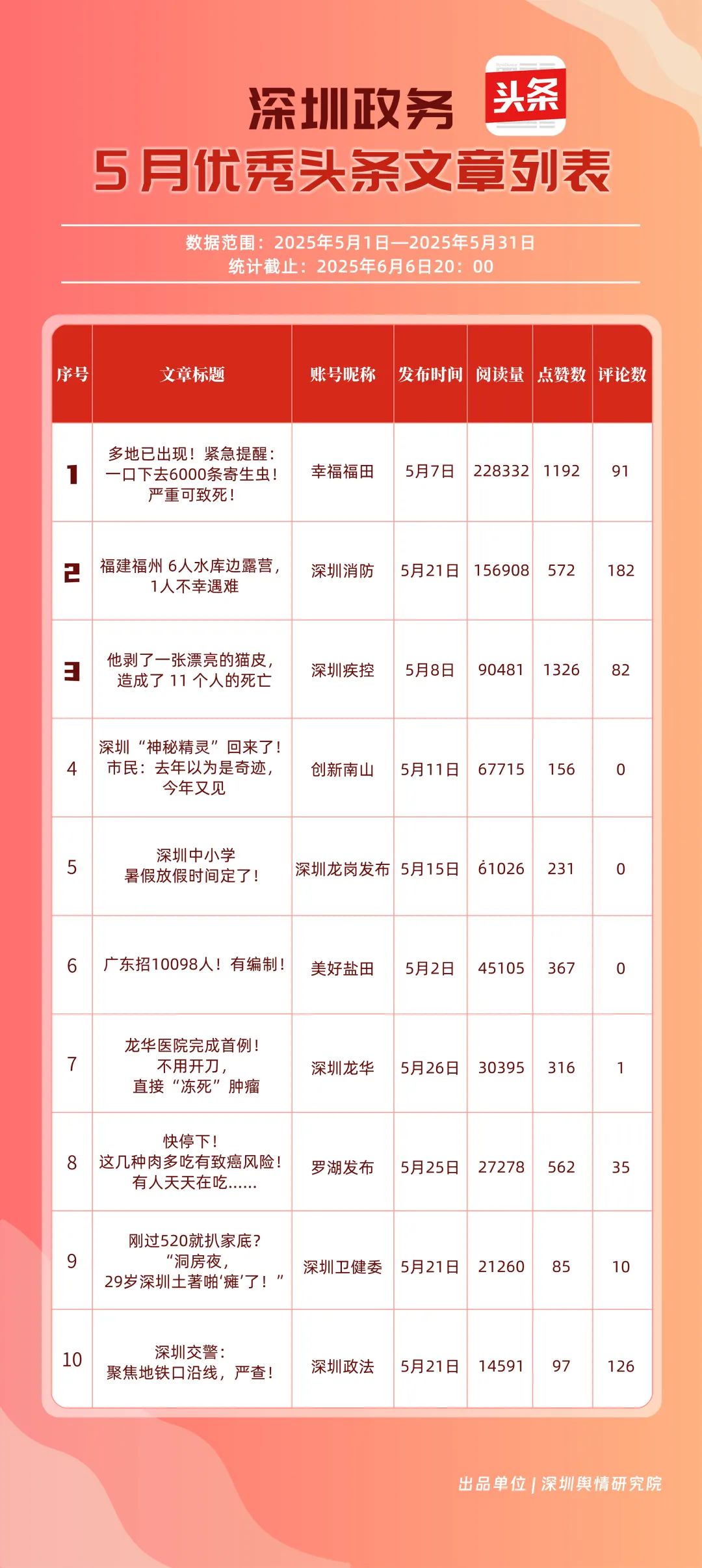 5月,“幸福福田”“深圳消防”“創(chuàng)新南山”“深圳疾控”“羅湖發(fā)布”“深圳龍崗發(fā)布”“坪山發(fā)布”“青春深圳”“深圳龍華”“深圳人社”共10個政務(wù)頭條號入選“優(yōu)秀政務(wù)頭條號”榜單。在榜單前三名中,“幸福福田”“創(chuàng)新南山”以穩(wěn)定且高質(zhì)量的內(nèi)容輸出,持續(xù)領(lǐng)跑,排名較上個月未發(fā)生變動。位居榜單第二的“深圳消防”同樣表現(xiàn)亮眼,排名較上個月提升2個名次,充分展現(xiàn)了其在消防安全宣傳領(lǐng)域的持續(xù)深耕和創(chuàng)新突破。上榜政務(wù)頭條號各展所長,以優(yōu)質(zhì)內(nèi)容為核心,充分發(fā)揮平臺傳播優(yōu)勢,為政務(wù)信息的高效觸達與廣泛傳播樹立了標(biāo)桿。