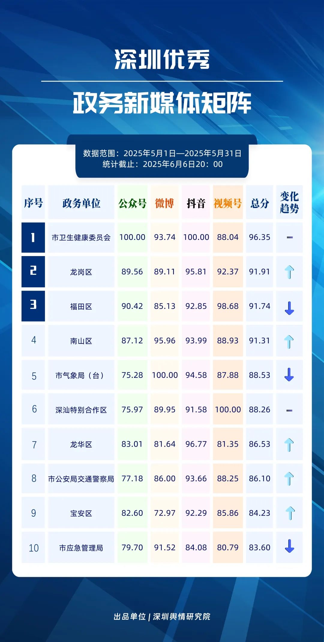 5月,深圳政務(wù)新媒體矩陣各展所長,為市民帶來豐富實用的信息服務(wù)。市衛(wèi)生健康委、龍崗區(qū)、福田區(qū)、南山區(qū)、市氣象局、深汕特別合作區(qū)、龍華區(qū)、市公安局交通警察局、寶安區(qū)、市應(yīng)急管理局入選“深圳優(yōu)秀政務(wù)新媒體矩陣”榜單。從排名變化來看,與4月相比,龍崗區(qū)、南山區(qū)、龍華區(qū)、市公安局交通警察局、寶安區(qū)的排名均有顯著提升。其中,龍崗區(qū)通過優(yōu)化微博和微信視頻號的內(nèi)容運營,有效提升了互動性和傳播效能;南山區(qū)則在微博和抖音平臺發(fā)力,取得了較好的運營成效。這些成績充分展現(xiàn)了各政務(wù)新媒體矩陣在運營方面的創(chuàng)新活力,為提升政府服務(wù)效能作出了積極貢獻。