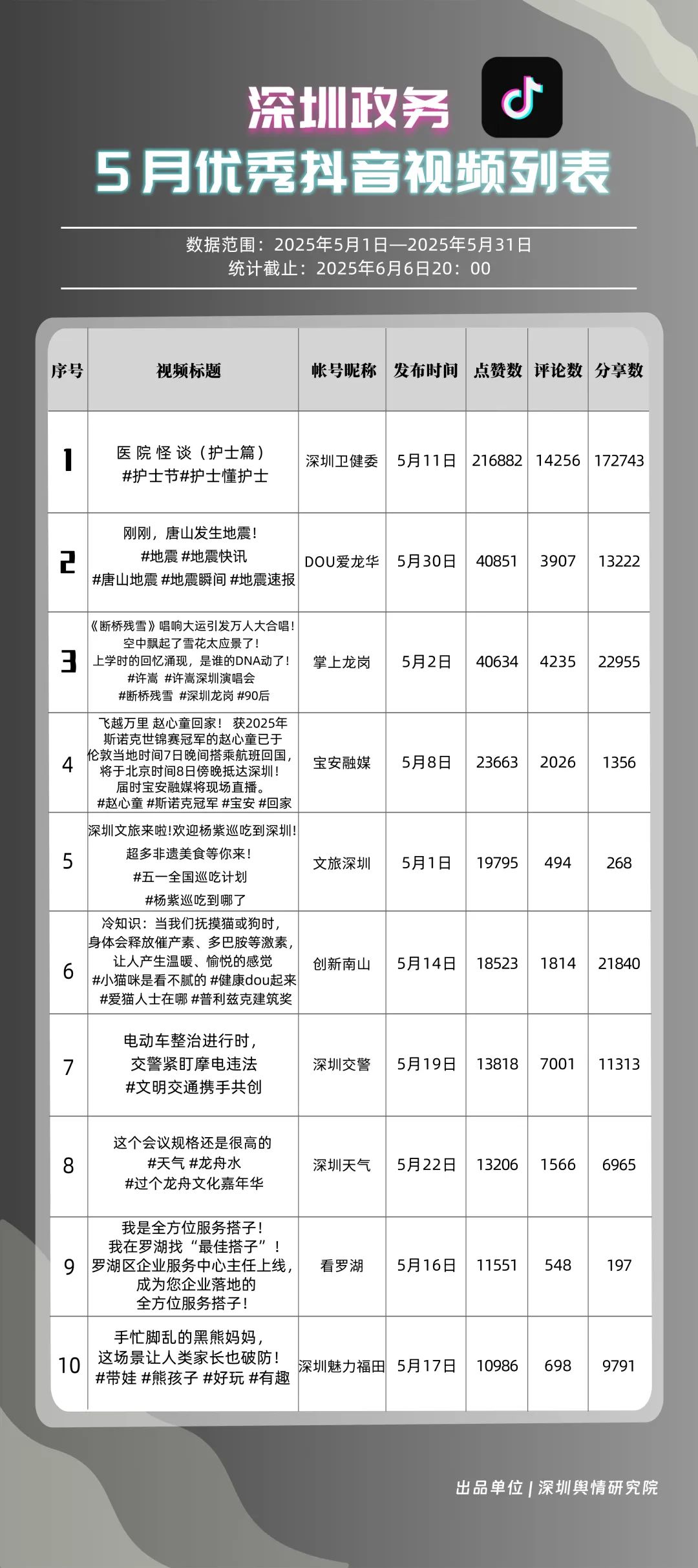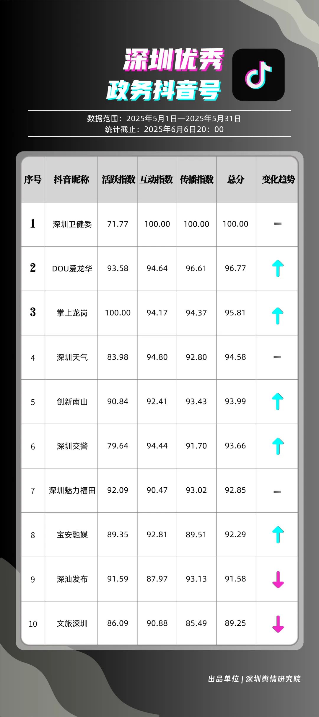 5月,“深圳衛(wèi)健委”“DOU愛龍華”“掌上龍崗”“深圳天氣”“創(chuàng)新南山”“深圳交警”“深圳魅力福田”“寶安融媒”“深汕發(fā)布”“文旅深圳”共10個政務(wù)抖音號獲得“優(yōu)秀政務(wù)抖音號”稱號。5月,“深圳衛(wèi)健委”憑借3條極具創(chuàng)意的視頻內(nèi)容持續(xù)收獲網(wǎng)民關(guān)注,穩(wěn)居榜首之位,成為政務(wù)抖音號領(lǐng)域的標(biāo)桿?!癉OU愛龍華”“掌上龍崗”較上個月排名大幅度上升,以96.77分和95.81分位居榜單第2、3名,彰顯出積極探索創(chuàng)新傳播路徑、開拓政務(wù)短視頻發(fā)展新可能的決心。以上優(yōu)秀政務(wù)抖音號通過多樣化的短視頻形式傳遞政務(wù)資訊,為深圳政務(wù)新媒體在短視頻領(lǐng)域的蓬勃發(fā)展注入強勁動能,成為政務(wù)信息傳播的新標(biāo)桿。