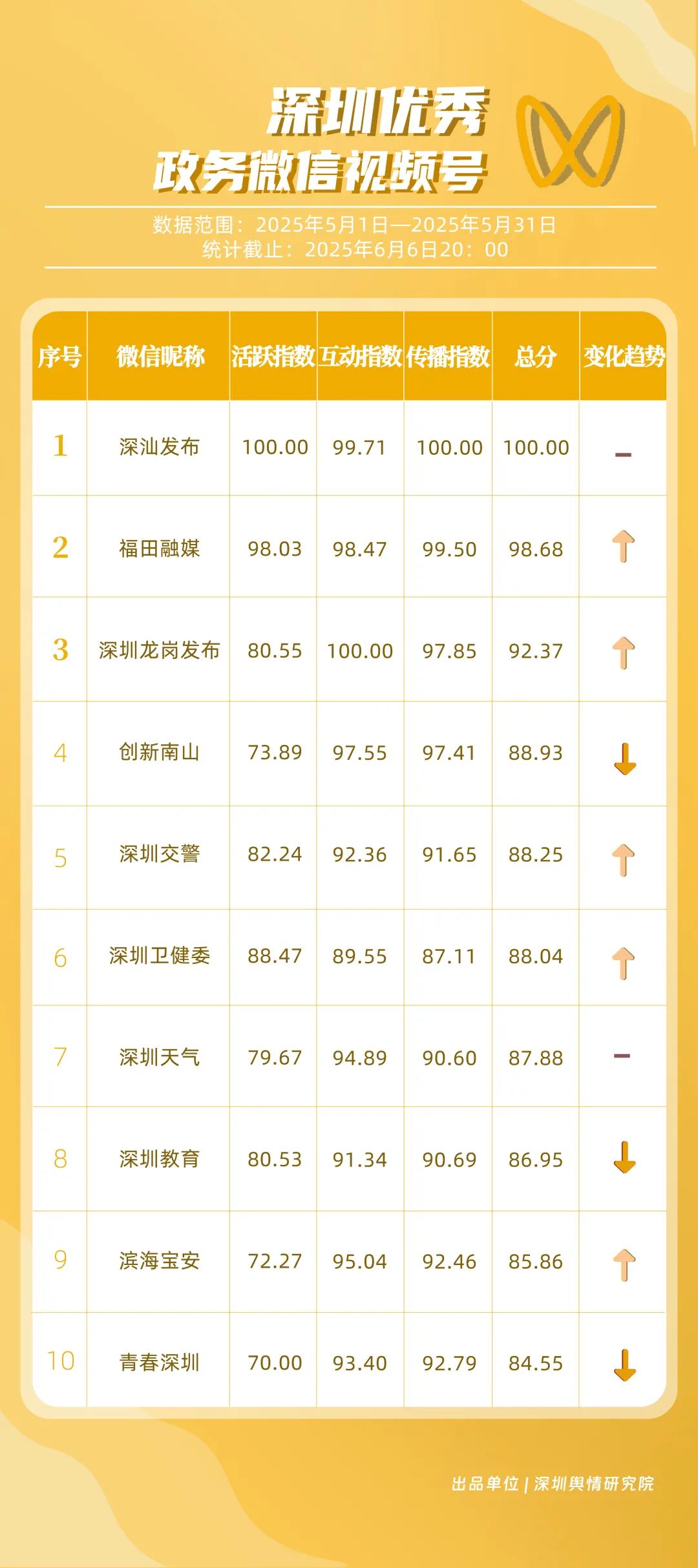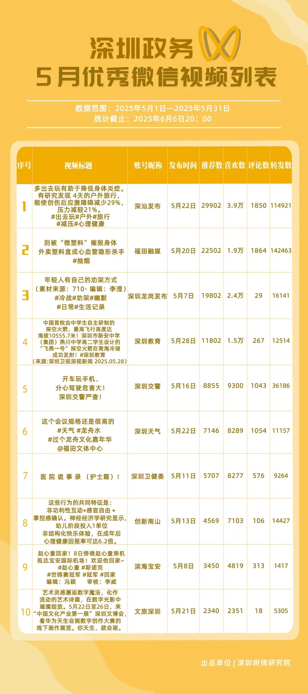 5月,獲得“深圳優(yōu)秀政務(wù)微信視頻號”稱號的是“深汕發(fā)布”“福田融媒”“深圳龍崗發(fā)布”“創(chuàng)新南山”“深圳交警”“深圳衛(wèi)健委”“深圳天氣”“深圳教育”“濱海寶安”“青春深圳”。其中,“深汕發(fā)布”保持了熱點內(nèi)容輸出的穩(wěn)定性和時效性,延續(xù)了上個月的優(yōu)異表現(xiàn)?!案L锶诿健薄吧钲邶垗彴l(fā)布”排名緊隨其后,其中“深圳龍崗發(fā)布”在互動指數(shù)方面獲得滿分,搭建了高效的政民互動橋梁。這些優(yōu)秀的政務(wù)微信視頻號以各自的優(yōu)勢,展現(xiàn)出深圳政務(wù)新媒體矩陣在視頻傳播賽道的蓬勃活力,為政務(wù)信息傳播開辟更親民和高效的賽道。