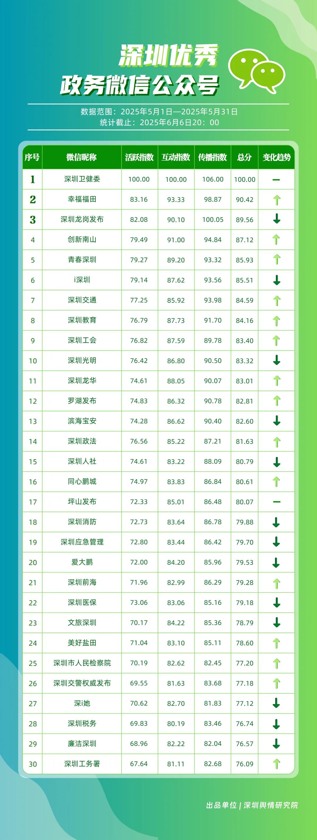 5月,30個政務(wù)微信公眾號入選“深圳優(yōu)秀政務(wù)微信公眾號”榜單,其中包括“深圳衛(wèi)健委”“幸福福田”“深圳龍崗發(fā)布”“創(chuàng)新南山”“青春深圳”“i深圳”“深圳交通”“深圳教育”“深圳工會”“深圳光明”等。其中,“深圳衛(wèi)健委”在活躍、互動、傳播3項指標(biāo)上獲得滿分,其亮眼數(shù)據(jù)彰顯了內(nèi)容創(chuàng)作的高質(zhì)量,位居榜單首位?!靶腋8L铩蓖瑯颖憩F(xiàn)出色,排名較上個月有所上升,以總分90.42的優(yōu)異成績位居榜單第2名;“深圳龍崗發(fā)布”“創(chuàng)新南山”“青春深圳”緊隨其后,以新穎的互動形式吸引用戶參與,表現(xiàn)值得肯定。上榜賬號充分發(fā)揮微信公眾平臺的傳播優(yōu)勢,以豐富多元的內(nèi)容形態(tài)、生動鮮活的表達風(fēng)格,持續(xù)為市民提供優(yōu)質(zhì)的信息服務(wù)。