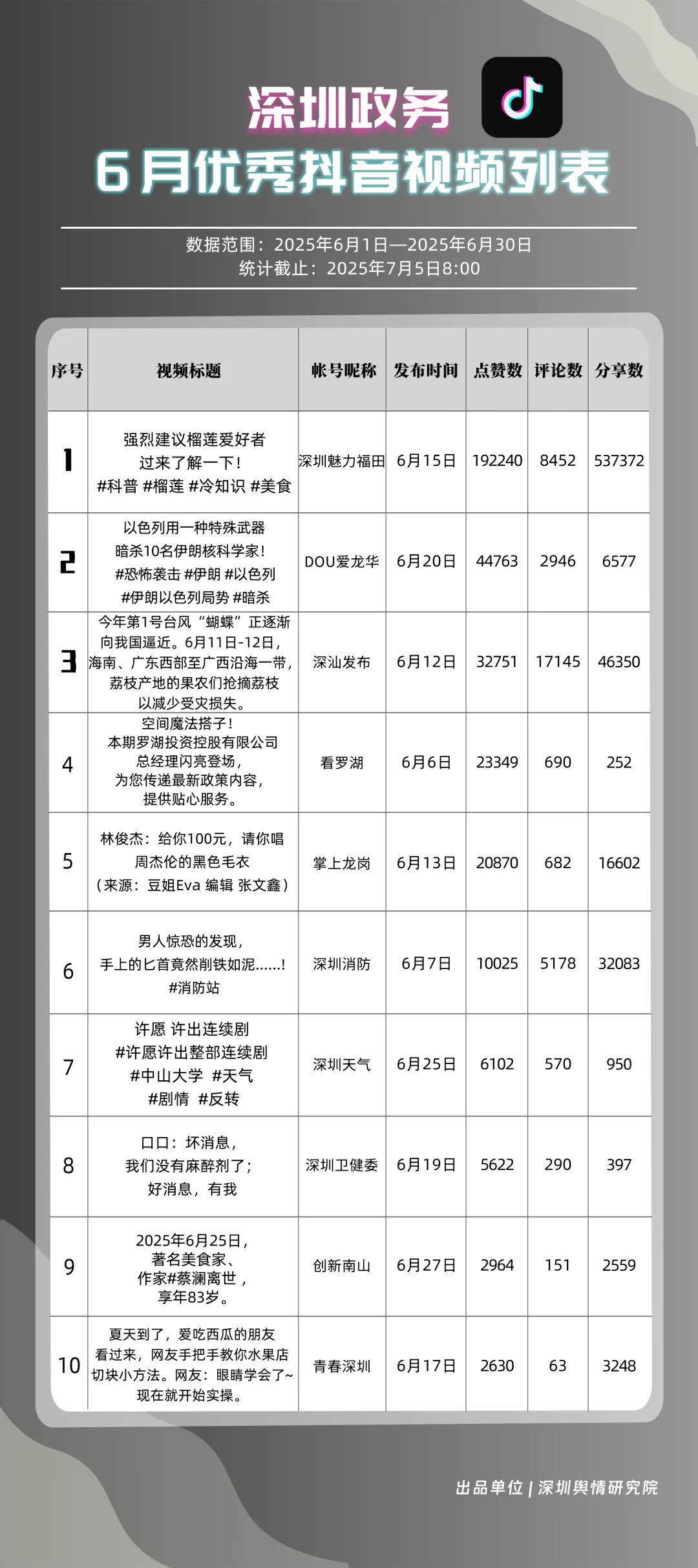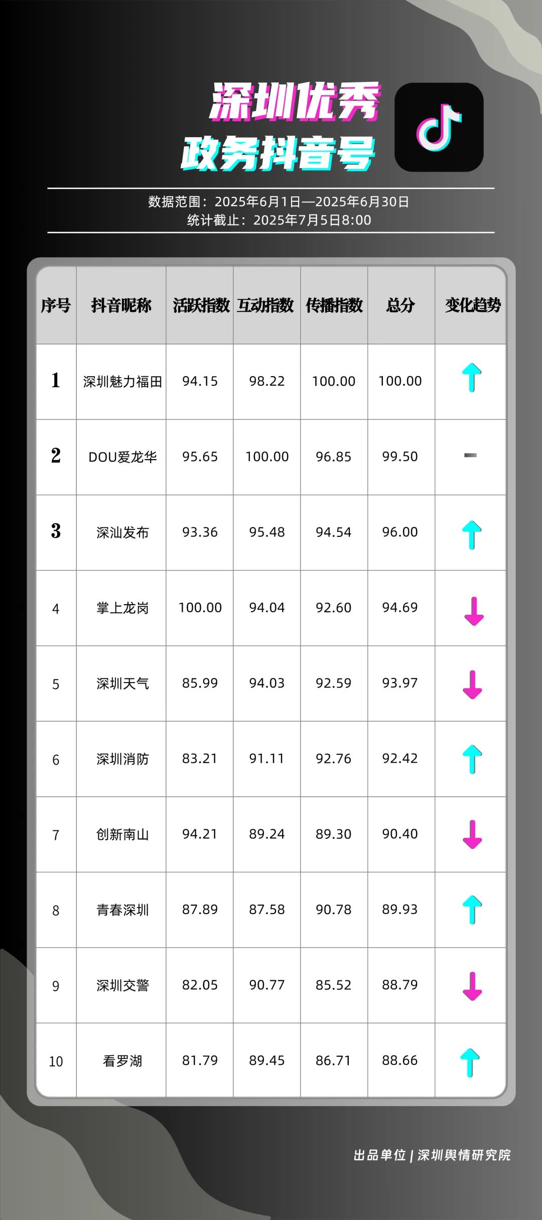 6月,“深圳魅力福田”“DOU愛龍華”“深汕發(fā)布”“掌上龍崗”“深圳天氣”“深圳消防”“創(chuàng)新南山”“青春深圳”“深圳交警”“看羅湖”共10個(gè)政務(wù)抖音號(hào)獲得“優(yōu)秀政務(wù)抖音號(hào)”稱號(hào)。6月,“深圳魅力福田”登頂,憑借其城市人文、社會(huì)熱點(diǎn)類主題短視頻,在傳播指數(shù)得分創(chuàng)新高;“DOU愛龍華”“深汕發(fā)布”“掌上龍崗”緊隨其后,通過各類熱點(diǎn)、創(chuàng)意內(nèi)容提升傳播效能?!吧钲谔鞖狻薄吧钲谙馈币脖憩F(xiàn)突出,短視頻內(nèi)容兼具“信息傳遞”與“情感共鳴”,用戶參與度持續(xù)提升,不斷為網(wǎng)民傳播有價(jià)值的政務(wù)信息資訊。