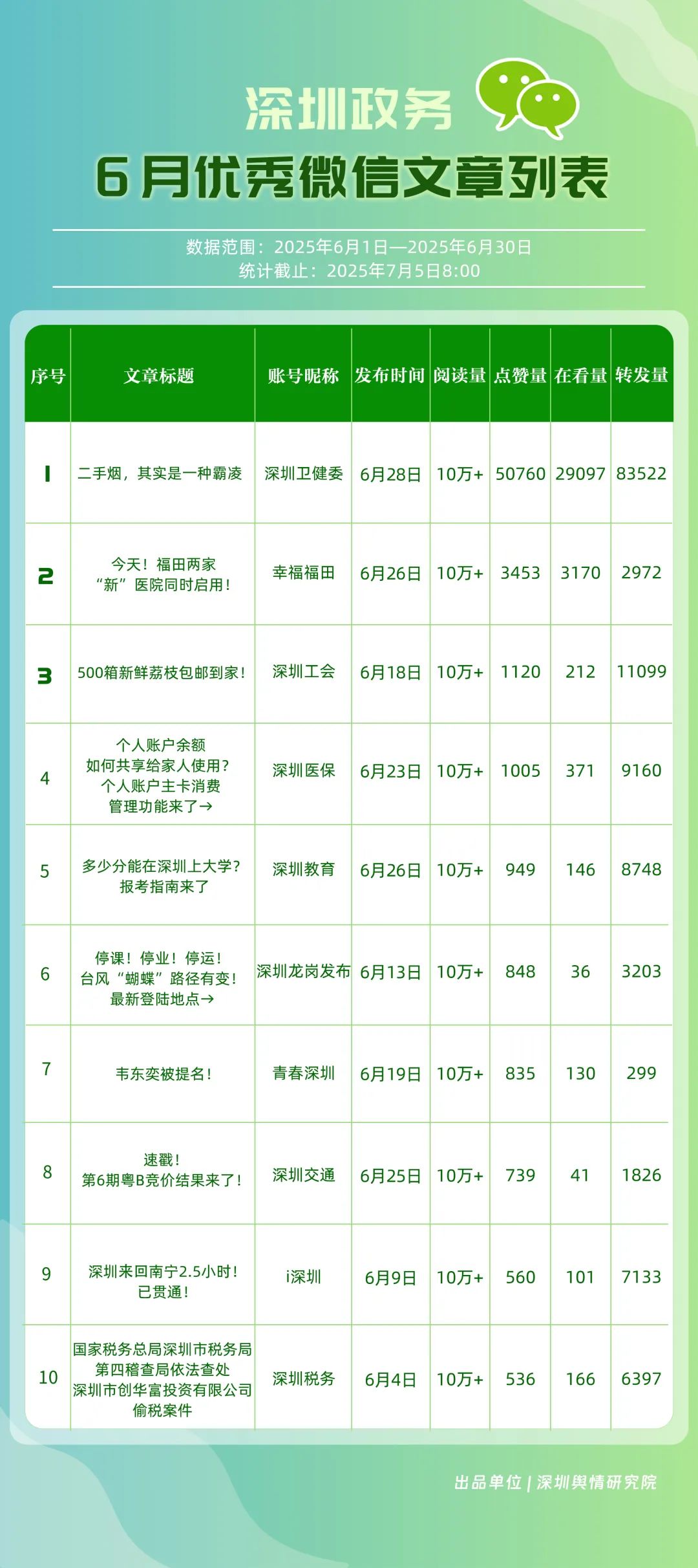 6月,“深圳幸福福田”“深圳消防”“創(chuàng)新南山”“羅湖發(fā)布”“深圳龍崗發(fā)布”“坪山發(fā)布”“深圳應(yīng)急管理”“深圳龍華”“深圳衛(wèi)健委”“青春深圳”共10個(gè)政務(wù)頭條號(hào)入選“優(yōu)秀政務(wù)頭條號(hào)”榜單?!吧钲谛腋8L铩薄吧钲谙馈薄皠?chuàng)新南山”連續(xù)位居榜單前3名,內(nèi)容具備較強(qiáng)的吸引力?!傲_湖發(fā)布”“深圳龍崗發(fā)布”排名也在榜單前列,排名較5月有所上升,在區(qū)域形象宣傳與民生服務(wù)中持續(xù)發(fā)力。