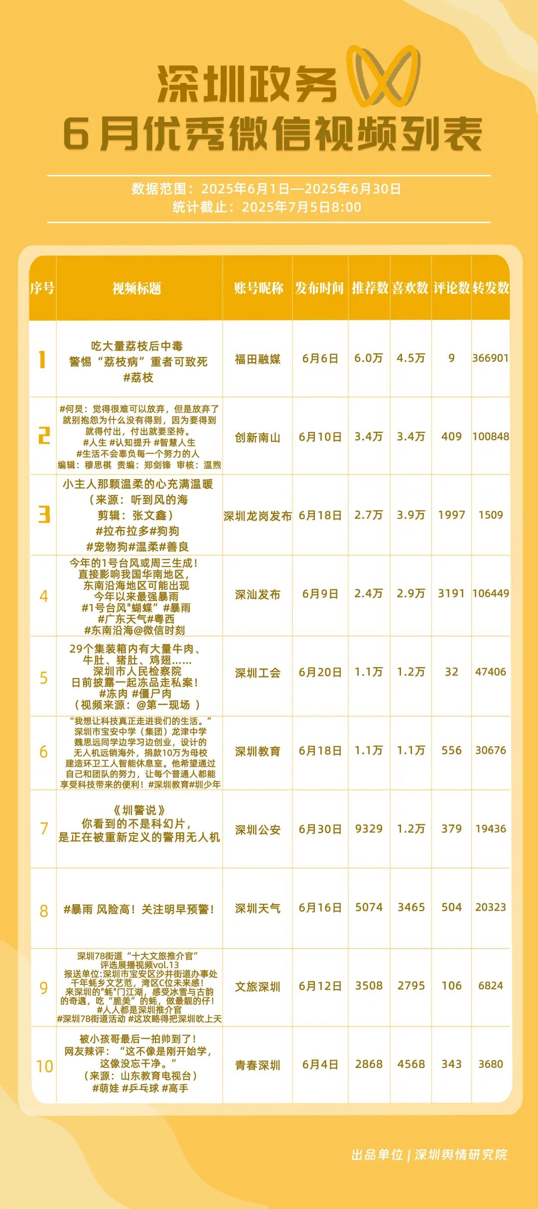 6月,獲得“深圳優(yōu)秀政務(wù)微信視頻號(hào)”稱號(hào)的是“福田融媒”“深汕發(fā)布”“深圳龍崗發(fā)布”“創(chuàng)新南山”“深圳教育”“深圳天氣”“青春深圳”“深圳公安”“文旅深圳”“深圳應(yīng)急管理”。其中,“福田融媒”以活躍、傳播指數(shù)雙滿分居榜首,其視頻《吃大量荔枝后中毒 警惕“荔枝病”重者可致死》獲得超36萬(wàn)次轉(zhuǎn)發(fā),成為爆款案例;“深汕發(fā)布”“深圳龍崗發(fā)布”“創(chuàng)新南山”得分在90分以上,在互動(dòng)、傳播方面表現(xiàn)亮眼。這些優(yōu)秀的政務(wù)微信視頻號(hào)以各自的獨(dú)特風(fēng)格持續(xù)發(fā)力,為政務(wù)及民生信息傳遞開拓更鮮活、暢通的路徑。