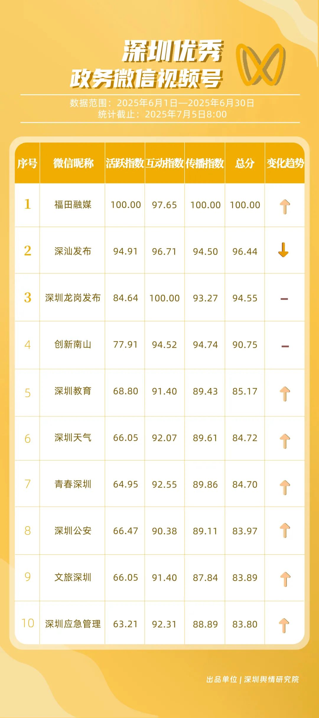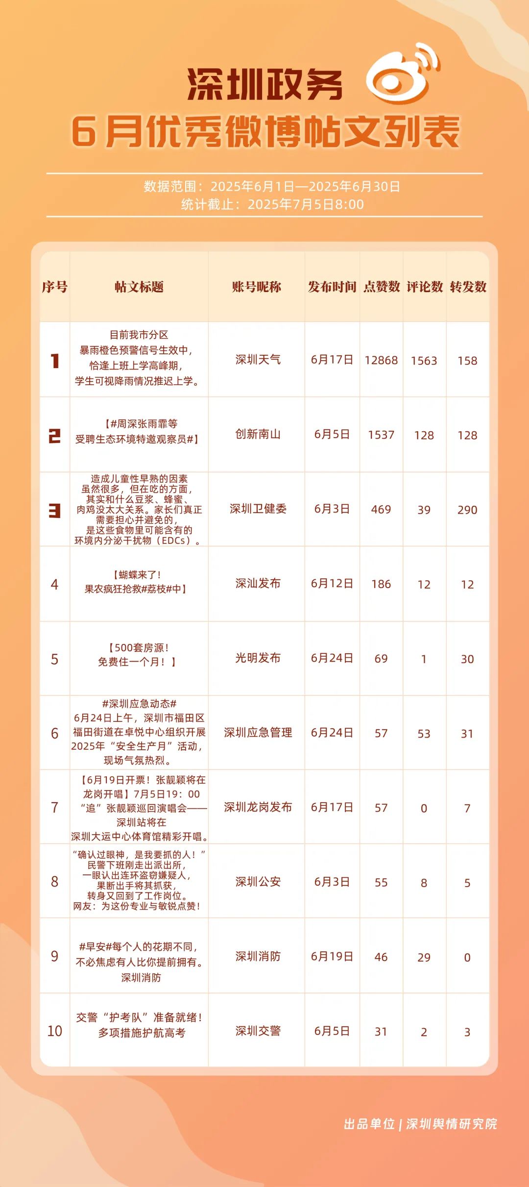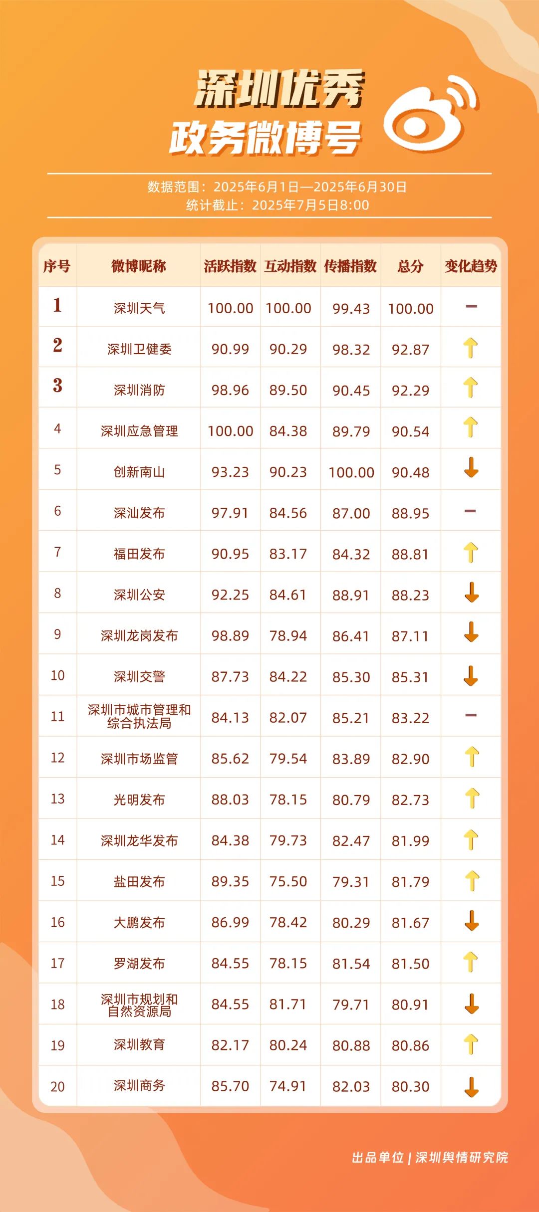 6月,“深圳天氣”“深圳衛(wèi)健委”“深圳消防”“深圳應(yīng)急管理”“創(chuàng)新南山”“深汕發(fā)布”“福田發(fā)布”“深圳公安”“深圳龍崗發(fā)布”“深圳交警”等20個(gè)賬號(hào)入選“優(yōu)秀政務(wù)微博號(hào)”。其中,“深圳天氣”以活躍、互動(dòng)指數(shù)雙滿分穩(wěn)居第一,氣象服務(wù)信息及時(shí)性與科普內(nèi)容趣味性獲市民高度認(rèn)可;“深圳衛(wèi)健委”“深圳消防”“深圳應(yīng)急管理”分別位列2至4位,通過熱點(diǎn)話題聯(lián)動(dòng)醫(yī)療、消防、應(yīng)急知識(shí)科普擴(kuò)大影響力,政務(wù)微博矩陣在突發(fā)事件響應(yīng)與民生服務(wù)中作用凸顯。