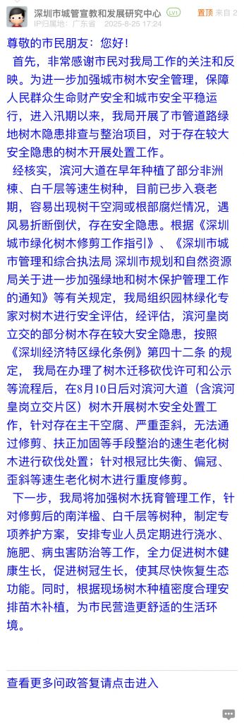 首先,非常感謝市民對我局工作的關(guān)注和反映。為進(jìn)一步加強(qiáng)城市樹木安全管理,保障人民群眾生命財產(chǎn)安全和城市安全平穩(wěn)運(yùn)行,進(jìn)入汛期以來,我局開展了市管道路綠地樹木隱患排查與整治項(xiàng)目,對于存在較大安全隱患的樹木開展處置工作。