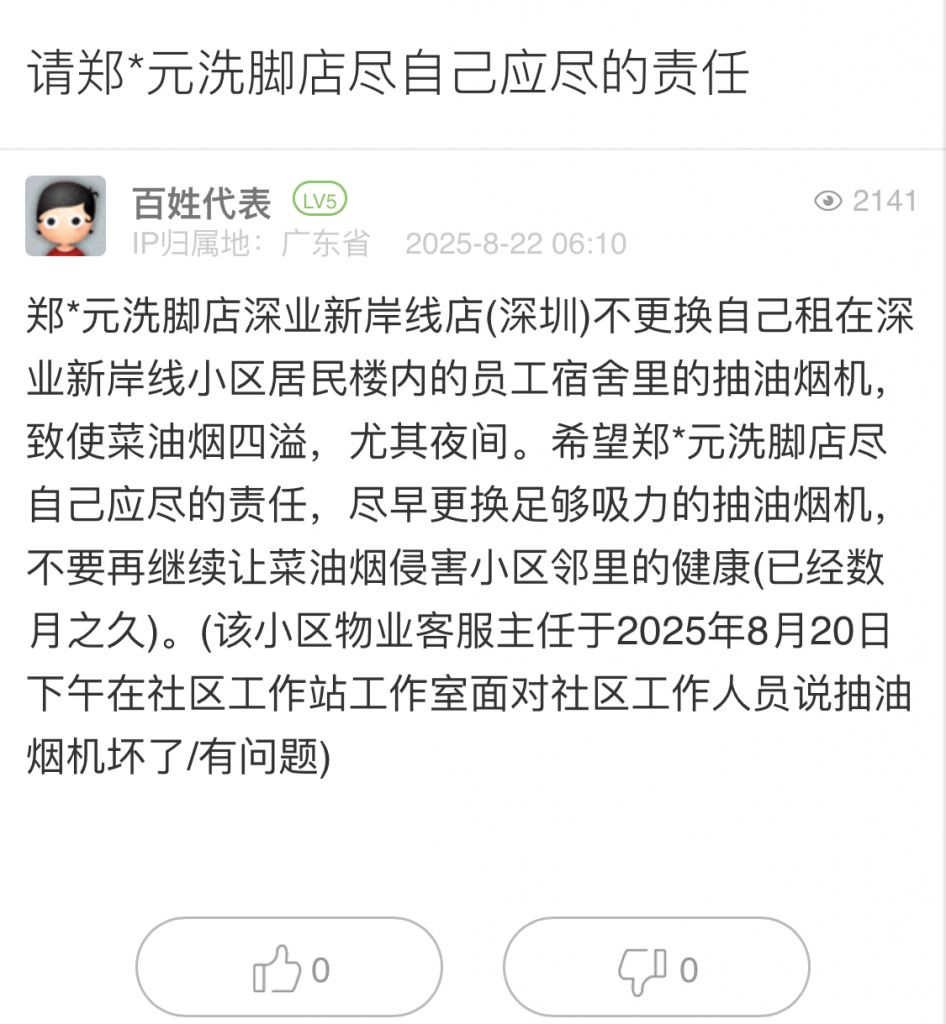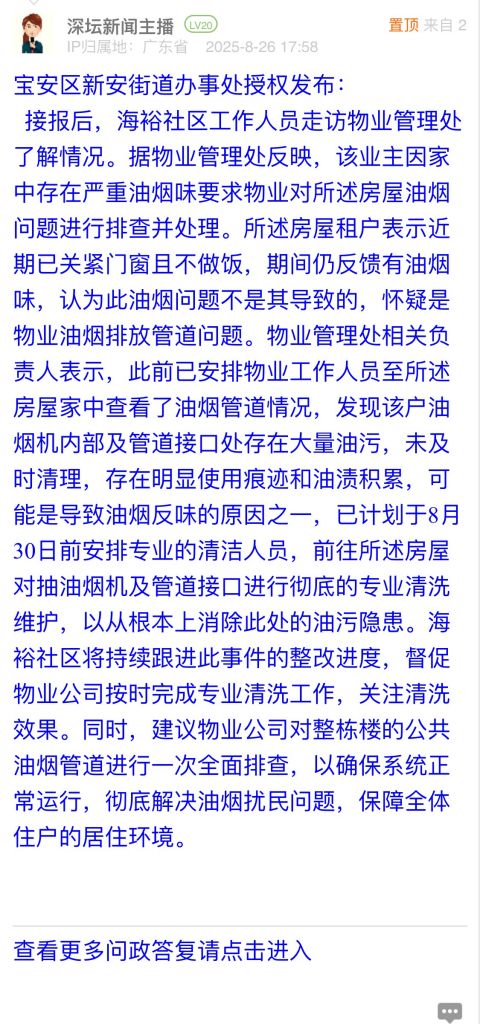 接報后,海裕社區(qū)工作人員走訪物業(yè)管理處了解情況。據(jù)物業(yè)管理處反映,該業(yè)主因家中存在嚴(yán)重油煙味要求物業(yè)對所述房屋油煙問題進(jìn)行排查并處理。所述房屋租戶表示近期已關(guān)緊門窗且不做飯,期間仍反饋有油煙味,認(rèn)為此油煙問題不是其導(dǎo)致的,懷疑是物業(yè)油煙排放管道問題。物業(yè)管理處相關(guān)負(fù)責(zé)人表示,此前已安排物業(yè)工作人員至所述房屋家中查看了油煙管道情況,發(fā)現(xiàn)該戶油煙機(jī)內(nèi)部及管道接口處存在大量油污,未及時清理,存在明顯使用痕跡和油漬積累,可能是導(dǎo)致油煙反味的原因之一,已計劃于8月30日前安排專業(yè)的清潔人員,前往所述房屋對抽油煙機(jī)及管道接口進(jìn)行徹底的專業(yè)清洗維護(hù),以從根本上消除此處的油污隱患。海裕社區(qū)將持續(xù)跟進(jìn)此事件的整改進(jìn)度,督促物業(yè)公司按時完成專業(yè)清洗工作,關(guān)注清洗效果。同時,建議物業(yè)公司對整棟樓的公共油煙管道進(jìn)行一次全面排查,以確保系統(tǒng)正常運(yùn)行,徹底解決油煙擾民問題,保障全體住戶的居住環(huán)境。