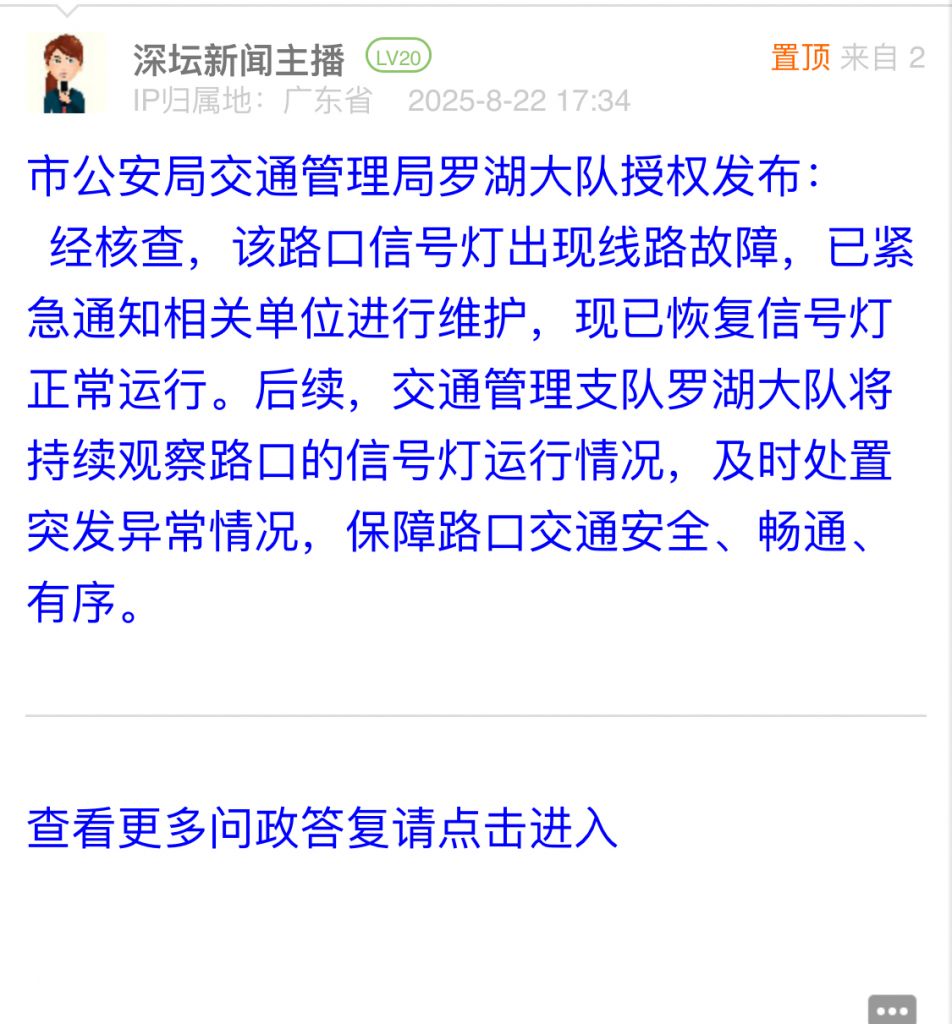 經(jīng)核查,該路口信號燈出現(xiàn)線路故障,已緊急通知相關(guān)單位進(jìn)行維護(hù),現(xiàn)已恢復(fù)信號燈正常運(yùn)行。后續(xù),交通管理支隊(duì)羅湖大隊(duì)將持續(xù)觀察路口的信號燈運(yùn)行情況,及時處置突發(fā)異常情況,保障路口交通安全、暢通、有序。