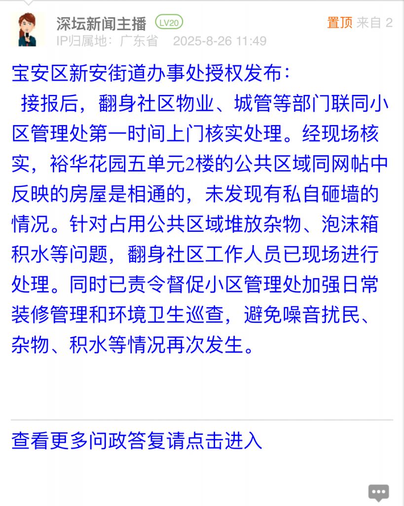 接報后,翻身社區(qū)物業(yè)、城管等部門聯(lián)同小區(qū)管理處第一時間上門核實(shí)處理。經(jīng)現(xiàn)場核實(shí),裕華花園五單元2樓的公共區(qū)域同網(wǎng)帖中反映的房屋是相通的,未發(fā)現(xiàn)有私自砸墻的情況。針對占用公共區(qū)域堆放雜物、泡沫箱積水等問題,翻身社區(qū)工作人員已現(xiàn)場進(jìn)行處理。同時已責(zé)令督促小區(qū)管理處加強(qiáng)日常裝修管理和環(huán)境衛(wèi)生巡查,避免噪音擾民、雜物、積水等情況再次發(fā)生。