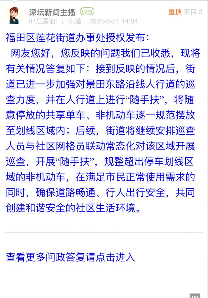 網(wǎng)友您好,您反映的問題我們已收悉,現(xiàn)將有關(guān)情況答復(fù)如下:接到反映的情況后,街道已進(jìn)一步加強(qiáng)對景田東路沿線人行道的巡查力度,并在人行道上進(jìn)行“隨手扶”,將隨意停放的共享單車、非機(jī)動車逐一規(guī)范擺放至劃線區(qū)域內(nèi);后續(xù),街道將繼續(xù)安排巡查人員與社區(qū)網(wǎng)格員聯(lián)動常態(tài)化對該區(qū)域開展巡查,開展“隨手扶”,規(guī)整超出停車劃線區(qū)域的非機(jī)動車,在滿足市民正常使用需求的同時,確保道路暢通、行人出行安全,共同創(chuàng)建和諧安全的社區(qū)生活環(huán)境。