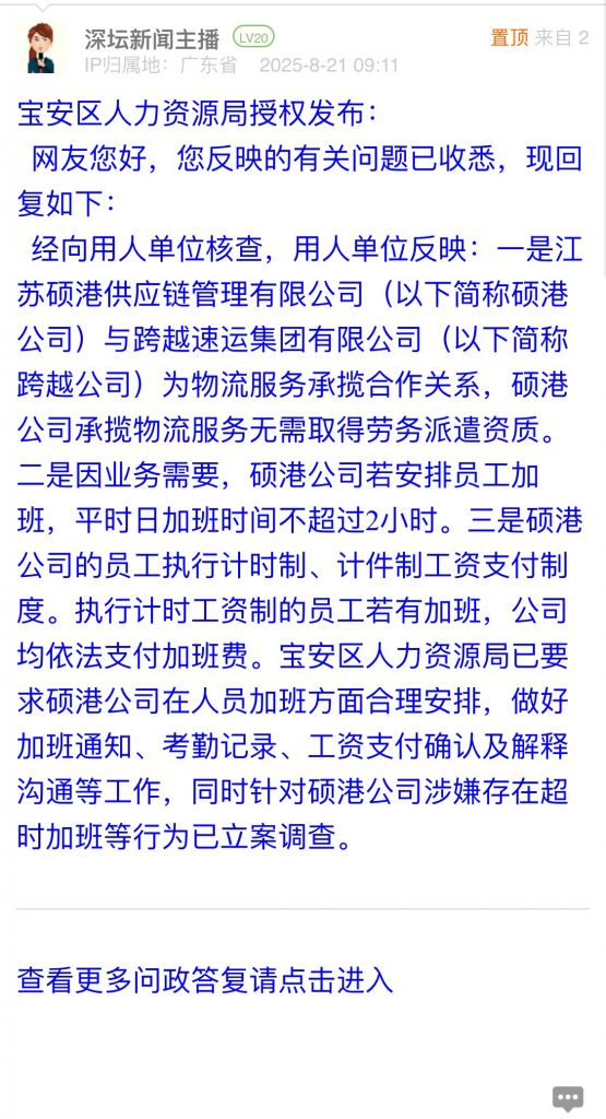 經(jīng)向用人單位核查,用人單位反映:一是江蘇碩港供應(yīng)鏈管理有限公司(以下簡稱碩港公司)與跨越速運(yùn)集團(tuán)有限公司(以下簡稱跨越公司)為物流服務(wù)承攬合作關(guān)系,碩港公司承攬物流服務(wù)無需取得勞務(wù)派遣資質(zhì)。二是因業(yè)務(wù)需要,碩港公司若安排員工加班,平時日加班時間不超過2小時。三是碩港公司的員工執(zhí)行計時制、計件制工資支付制度。執(zhí)行計時工資制的員工若有加班,公司均依法支付加班費(fèi)。寶安區(qū)人力資源局已要求碩港公司在人員加班方面合理安排,做好加班通知、考勤記錄、工資支付確認(rèn)及解釋溝通等工作,同時針對碩港公司涉嫌存在超時加班等行為已立案調(diào)查。