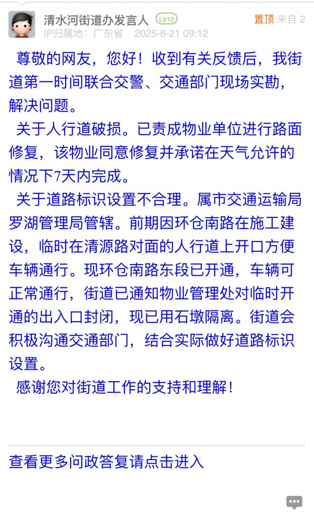 關(guān)于道路標(biāo)識設(shè)置不合理。屬市交通運(yùn)輸局羅湖管理局管轄。前期因環(huán)倉南路在施工建設(shè),臨時在清源路對面的人行道上開口方便車輛通行。現(xiàn)環(huán)倉南路東段已開通,車輛可正常通行,街道已通知物業(yè)管理處對臨時開通的出入口封閉,現(xiàn)已用石墩隔離。街道會積極溝通交通部門,結(jié)合實(shí)際做好道路標(biāo)識設(shè)置。