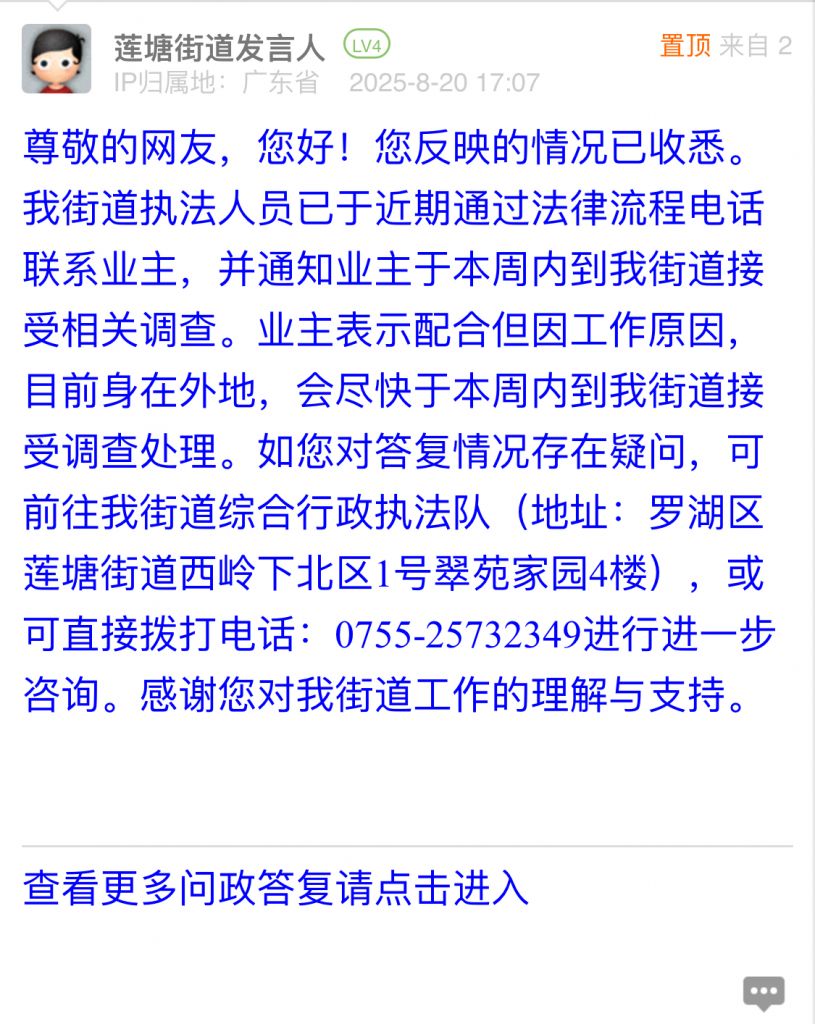 尊敬的網(wǎng)友,您好!您反映的問題已收悉。我街道已按照法律流程,向當(dāng)事人送達(dá)相關(guān)法律文書,并按照文書內(nèi)容,告知當(dāng)事人帶上相關(guān)資料在規(guī)定期限內(nèi)到我街道接受處理。如您對答復(fù)情況存在疑問,可前往我街道綜合行政執(zhí)法隊(duì)(地址:羅湖區(qū)蓮塘街道西嶺下北區(qū)1號翠苑家園4樓),或可直接撥打電話:0755-25732349進(jìn)行進(jìn)一步咨詢。感謝您對我街道工作的理解與支持。