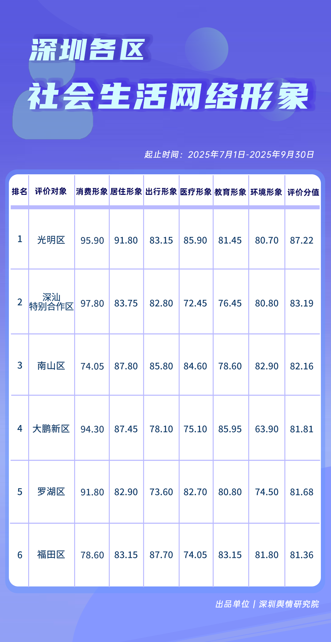 7-9月,《深圳各區(qū)社會生活網(wǎng)絡(luò)形象榜》中,光明區(qū)憑借在消費(fèi)、居住等方面的良好網(wǎng)絡(luò)呈現(xiàn),獲得較高綜合評價分值,深汕特別合作區(qū)、南山區(qū)也表現(xiàn)優(yōu)異,得分在83分左右。大鵬新區(qū)、羅湖區(qū)、福田區(qū)也在榜單中占據(jù)靠前位置,體現(xiàn)了各區(qū)在社會生活方面的網(wǎng)絡(luò)形象情況,也反映出各區(qū)在提升民生服務(wù)質(zhì)量與促進(jìn)區(qū)域協(xié)調(diào)發(fā)展方面取得的積極成效。