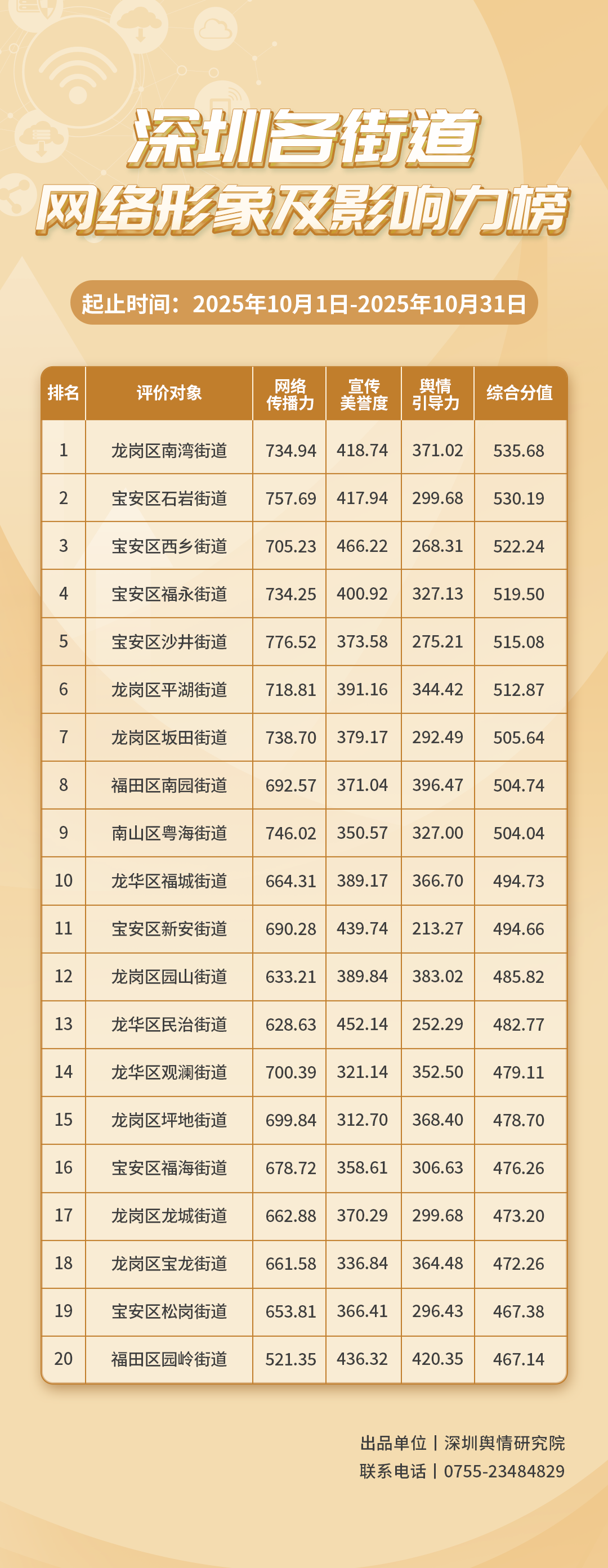 2025年10月,共有20個(gè)街道登上《深圳各街道網(wǎng)絡(luò)形象及影響力榜》,分別是:龍崗區(qū)南灣街道、寶安區(qū)石巖街道、寶安區(qū)西鄉(xiāng)街道、寶安區(qū)福永街道、寶安區(qū)沙井街道、龍崗區(qū)平湖街道、龍崗區(qū)坂田街道、福田區(qū)南園街道、南山區(qū)粵海街道、龍華區(qū)福城街道、寶安區(qū)新安街道、龍崗區(qū)園山街道、龍華區(qū)民治街道、龍華區(qū)觀瀾街道、龍崗區(qū)坪地街道、寶安區(qū)福海街道、龍崗區(qū)龍城街道、龍崗區(qū)寶龍街道、寶安區(qū)松崗街道、福田區(qū)園嶺街道。
