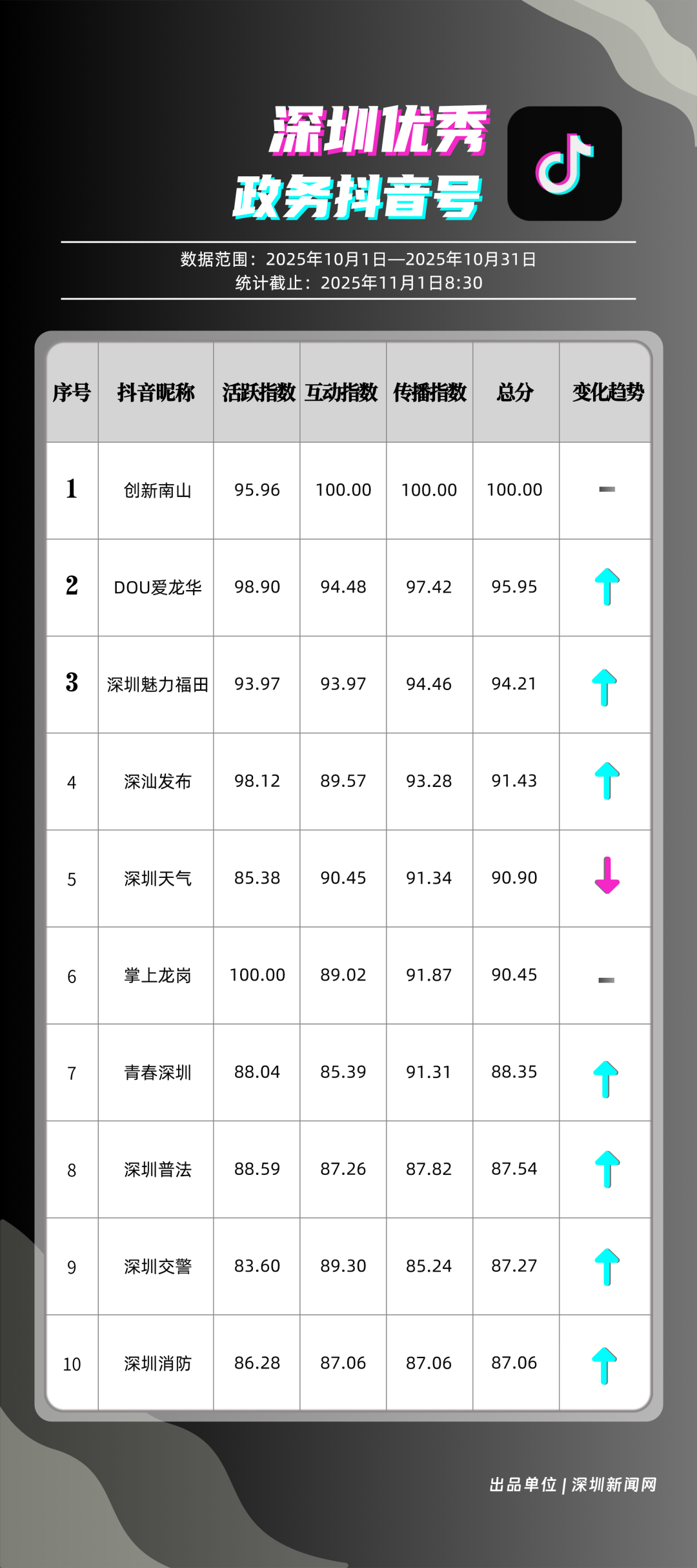 10月,獲得“優(yōu)秀政務(wù)抖音號(hào)”稱號(hào)的是“創(chuàng)新南山”“DOU愛龍華”“深圳魅力福田”“深汕發(fā)布”“深圳天氣”“掌上龍崗”“青春深圳”“深圳普法”“深圳交警”“深圳消防”?!皠?chuàng)新南山”以總分100分居于榜首,展現(xiàn)出其內(nèi)容創(chuàng)作對(duì)用戶的強(qiáng)大吸引力與傳播力;“DOU愛龍華”與“深圳魅力福田”分別位列第二、三位,得分在95分左右,排名較上期有所上升?!吧钌前l(fā)布”“深圳天氣”“掌上龍崗”等賬號(hào)得分均在90分以上,以年輕化表達(dá)展示實(shí)用信息,也收獲較好互動(dòng)、傳播成績(jī)。