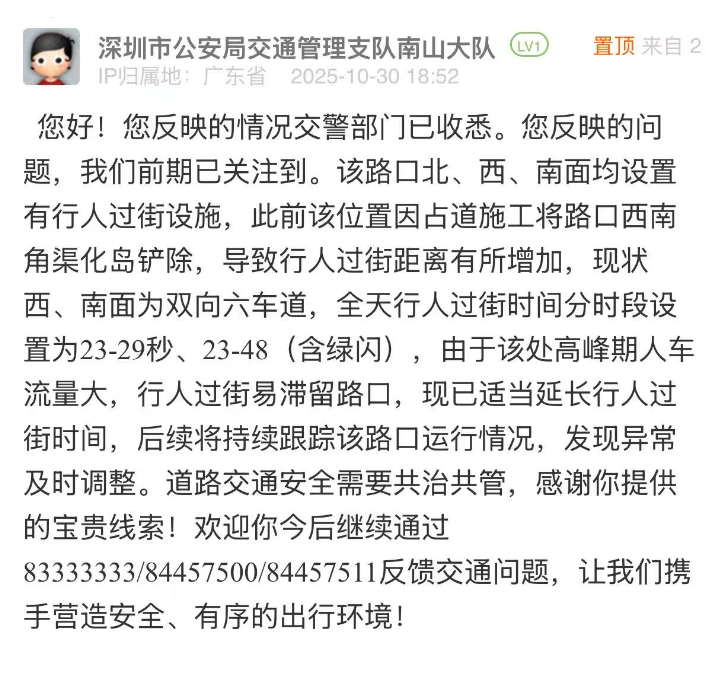 案例點評:南山交管部門在24小時內(nèi)對市民所反饋的問題進行答復,展現(xiàn)出精準、高效的治理態(tài)度,既說明過街時間短的原因,又根據(jù)該路口在高峰期人流大的實際情況,適當延長過街時間,體現(xiàn)出“因需調(diào)整、務(wù)實便民”的理念?;貞?yīng)中,該部門還強調(diào)后續(xù)將持續(xù)跟蹤路口通行情況、及時優(yōu)化調(diào)整等,展示了精細化治理的決心和理念。