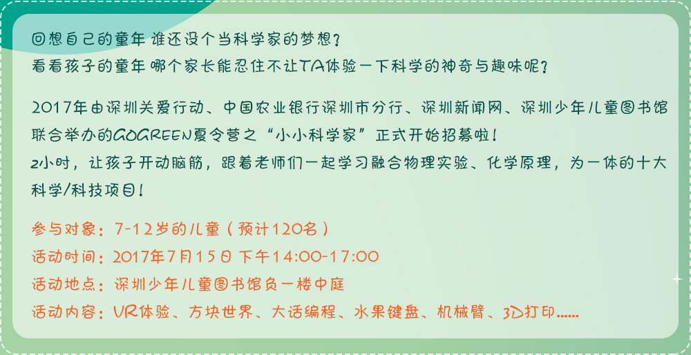 GO GREEN綠色夏令營(yíng)之“小小科學(xué)家”活動(dòng)由深圳市關(guān)愛(ài)辦、中國(guó)農(nóng)業(yè)銀行深圳市分行、深圳新聞網(wǎng)、深圳市少年兒童圖書(shū)館聯(lián)合舉辦。2個(gè)小時(shí)的活動(dòng),讓孩子開(kāi)動(dòng)腦筋,跟著老師學(xué)習(xí)融合物理實(shí)驗(yàn)、化學(xué)原理,為一體的十大科學(xué)/科技項(xiàng)目。[詳細(xì)]